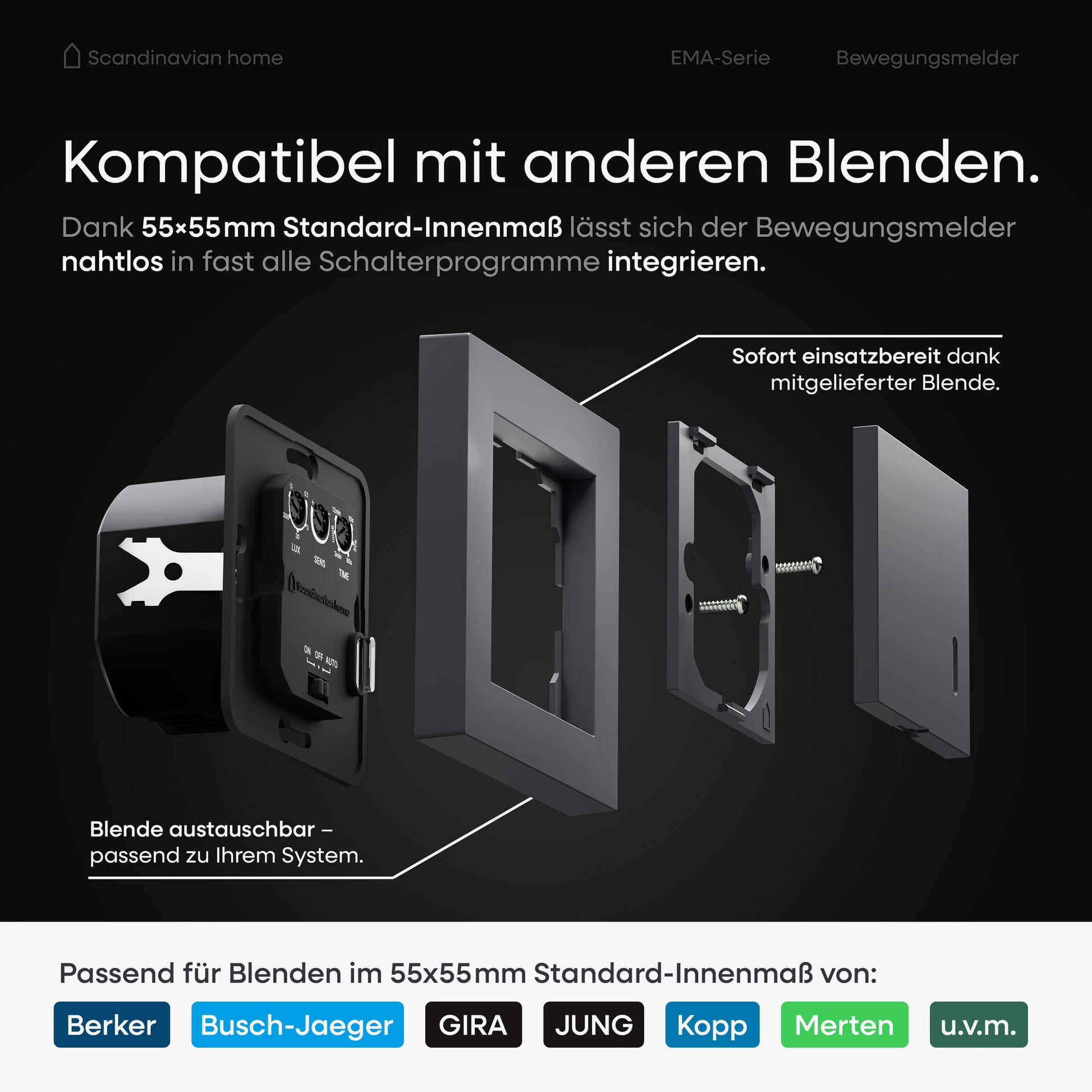 Hohe Kompatibilität dank austauschbarem Rahmen: Der Bewegungsmelder passt auch perfekt in Rahmen anderer Marken mit Standard-Innenmaß 55x55 mm, wie z. B. Gira System 55, Jung, Berker, Busch-Jaeger, Merten, Kopp u. v. m. – für einfache Integration ins bestehende Schalterprogramm.