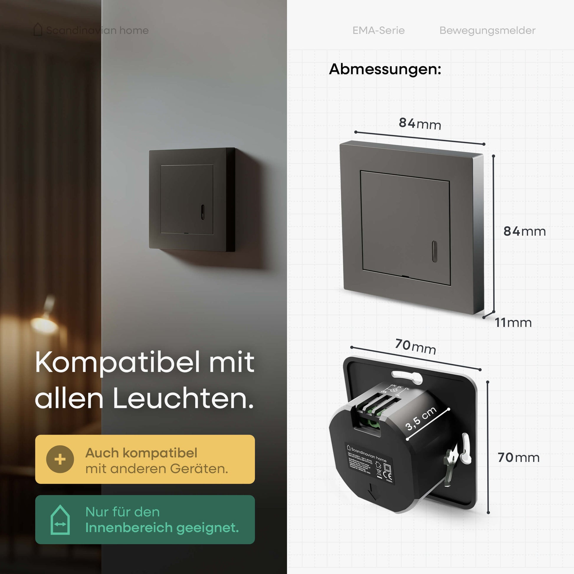Hohe Kompatibilität dank austauschbarem Rahmen: Der Bewegungsmelder passt in alle Rahmen mit Standard-Innenmaß 55 × 55 mm, z. B. Gira, Jung, Berker, Busch-Jaeger, Merten, Kopp – für einfache Integration ins bestehende Schalterprogramm.