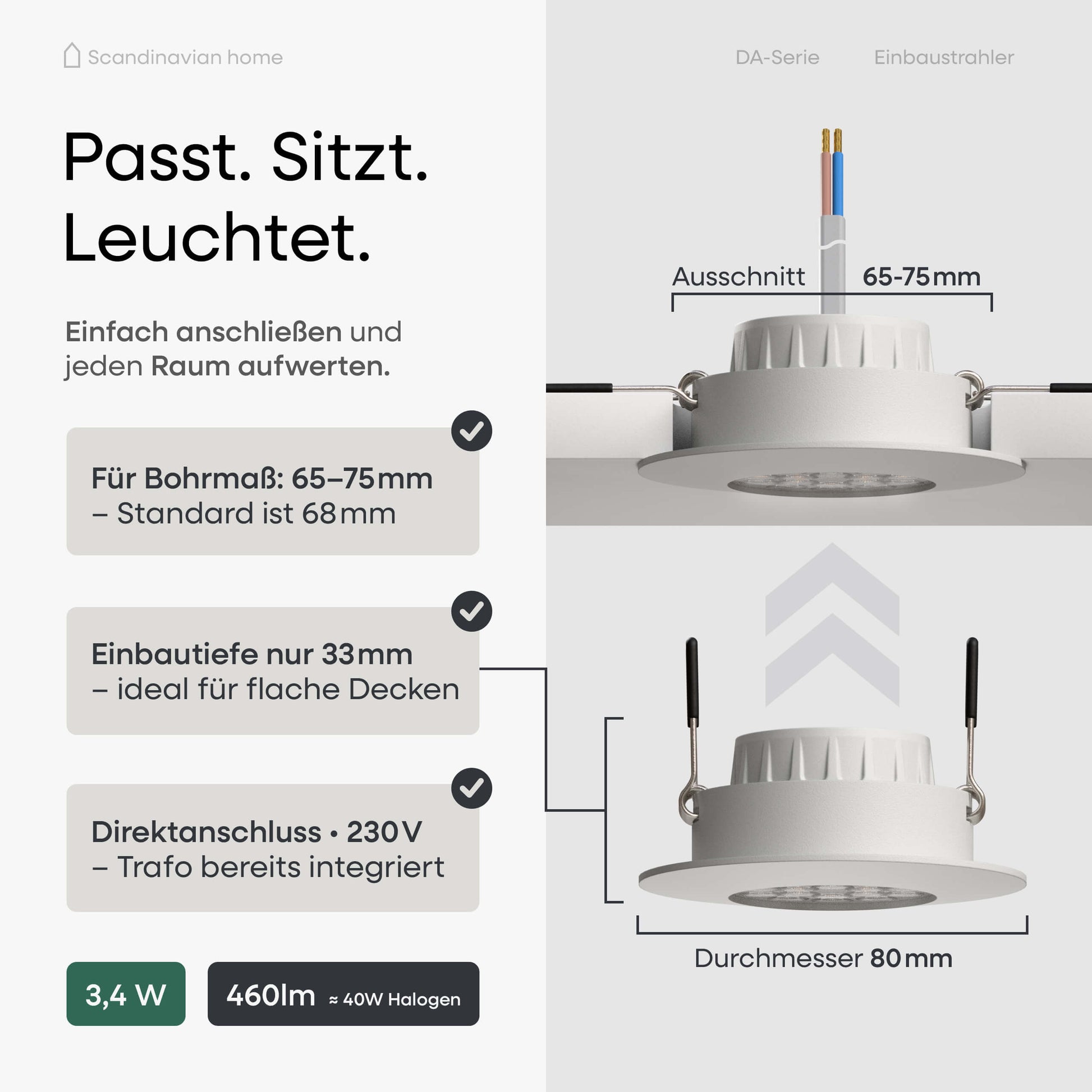 Einfach montiert – sofort einsatzbereit: Die LED Einbaustrahler passen dank Einbautiefe von nur 33 mm auch für flache Decken und werden direkt an 230V angeschlossen - kein Trafo nötig. Lieferumfang: 3x LED Spot, 4x Milchglasfolie (inkl. Testfolie) & deutsche Anleitung. Bei Fragen hilft Ihnen unser Scandinavian home Kundenservice gerne.