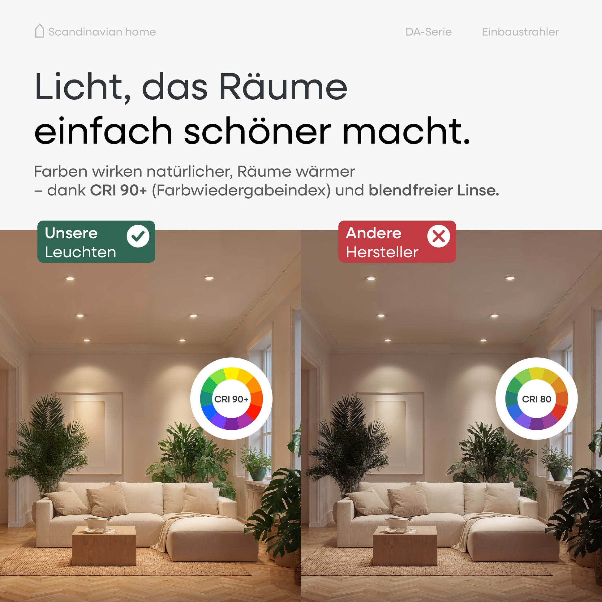 Stimmungsvolles Licht – natürlich & flexibel: Dimmbare LED Spots für entspannte Abende oder volle Helligkeit beim Arbeiten. Die Einbaustrahler schaffen mit warmweißem Licht ein wohnliches Ambiente. CRI 90+ zeigt Farben natürlich und lebhaft. Wählen Sie per Milchglasfolie gezielt zwischen Akzentbeleuchtung oder gleichmäßiger Ausleuchtung.