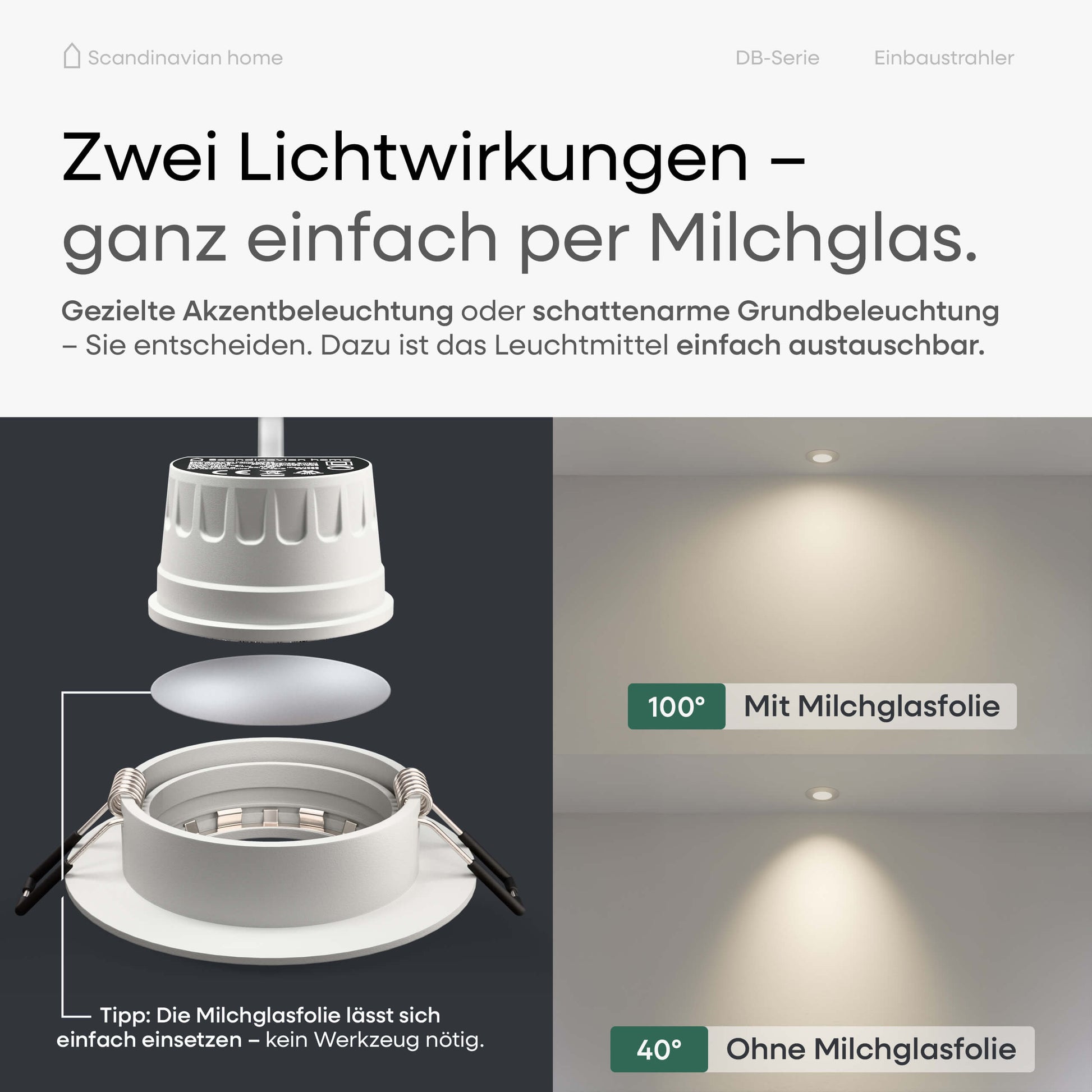 Stimmungsvolles Licht – natürlich & flexibel: Dimmbare LED Spots für entspannte Abende oder volle Helligkeit beim Arbeiten. Die Einbaustrahler schaffen mit warmweißem Licht ein wohnliches Ambiente. CRI 90+ zeigt Farben natürlich und lebhaft. Wählen Sie per Milchglasfolie gezielt zwischen Akzentbeleuchtung oder gleichmäßiger Ausleuchtung.